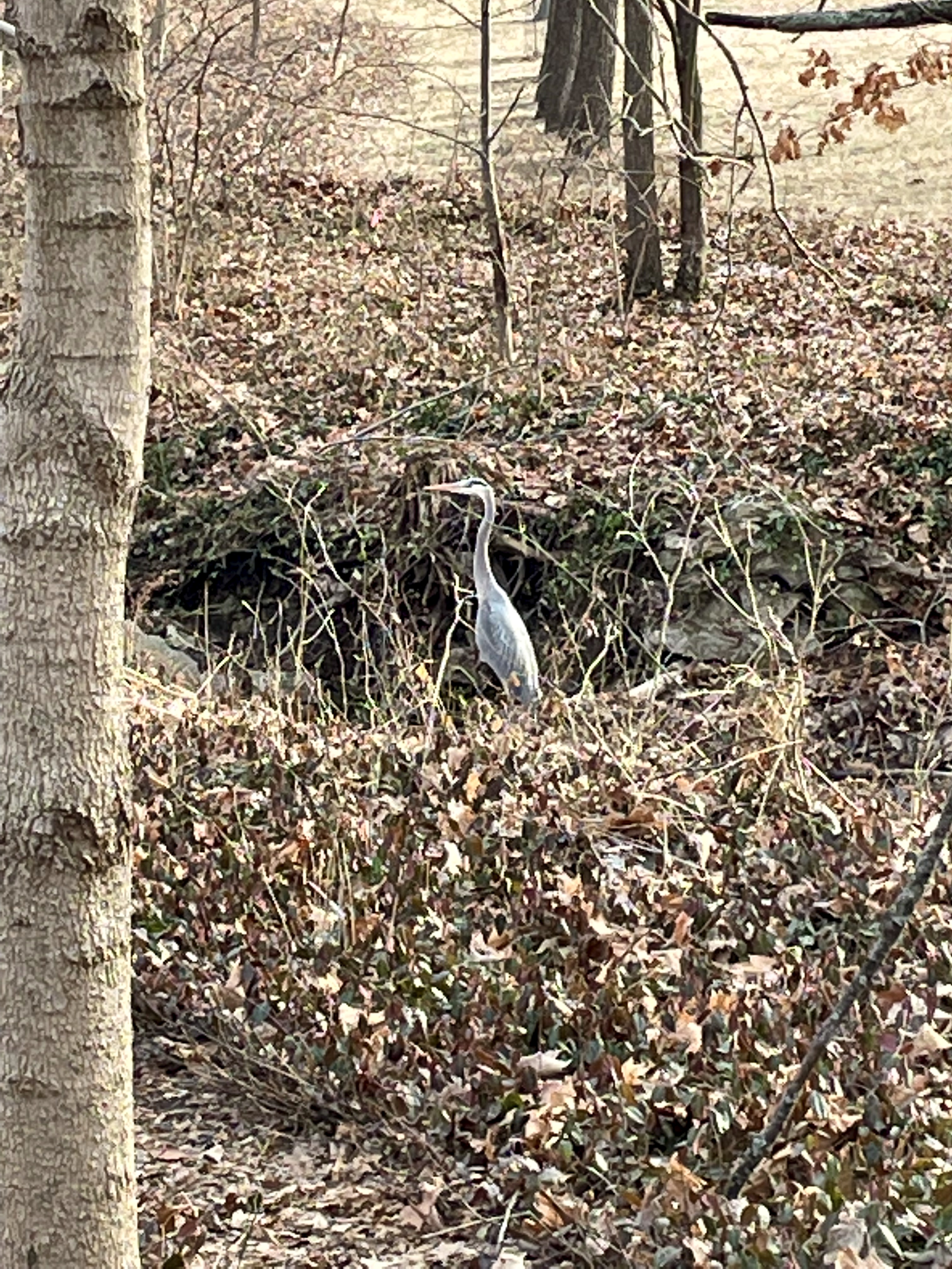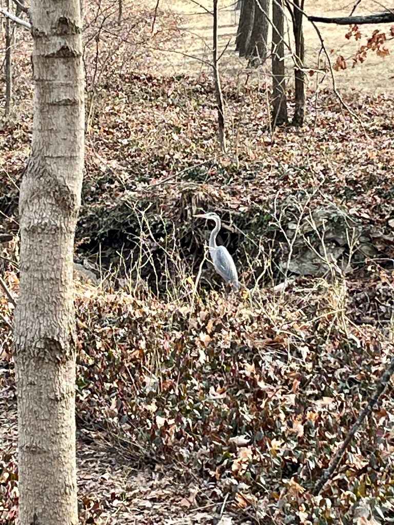 I went to the park near my house, the one I’ve walked through hundreds of times. As I approached the footbridge over the creek, something with an enormous wingspan flew down to the water. I’ve seen a variety of birds around here over the years, but never before a great blue heron.