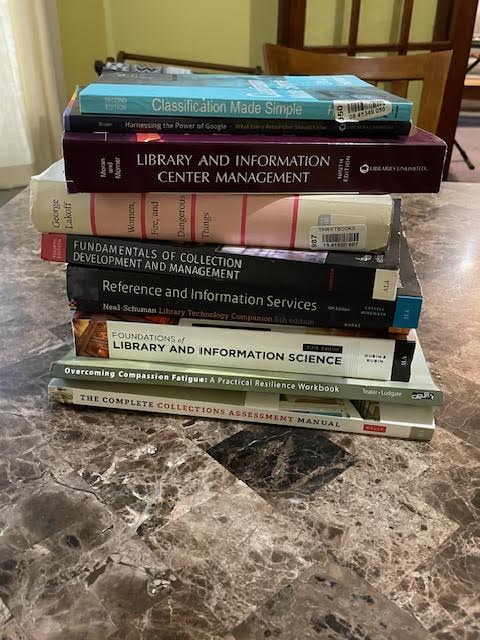 A representative sample of some of the textbooks I read. Yes, the book in the left corner is relevant to library work – very. much so. I burned through a few highlighters.