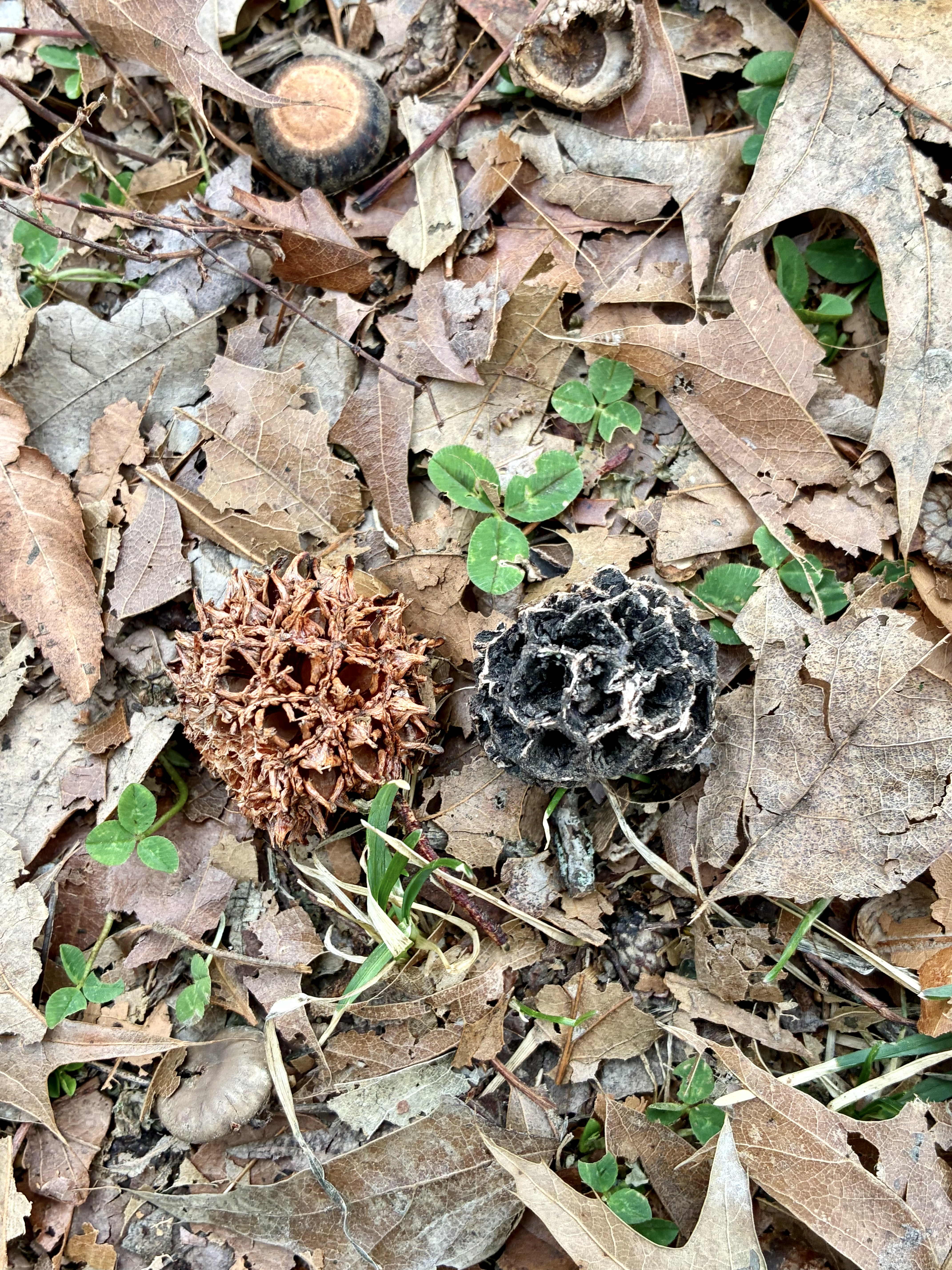 First, I was walking near a sweetgum tree. Nonetheless, it took me a minute to realize what the darker object in this photo is.
