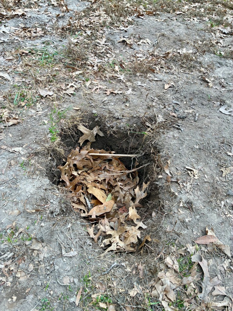 I estimate the hole to be somewhere between 1 and 1/2 to 2 feet on the long side. Definitely big enough my entire shoe would have fit in. I tried to plumb the depths through the leaf fill using a stick I found, but I’m not sure if I hit the bottom. I’d say it’s at least as deep as it is long.