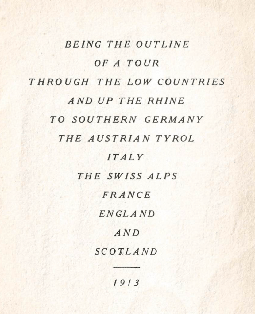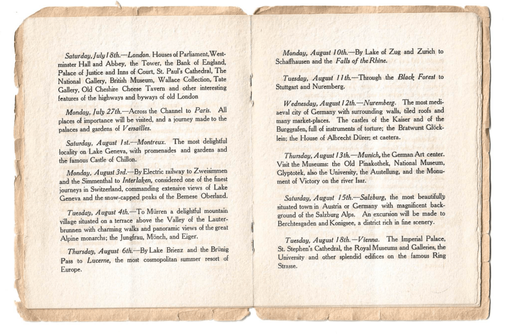 A few weeks ago, our neighborhood hosted a day of garage sales, and these two curiosities made their way home with me–tour itineraries for England, Wales, and Contintental Europe, for the years 1913 and 1914.