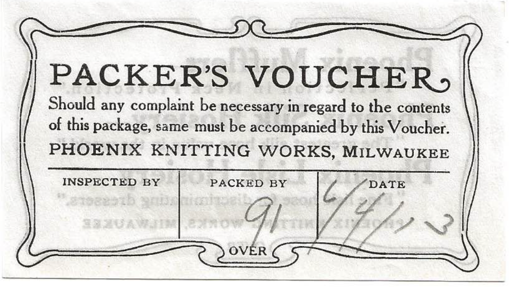As an added item of interest, when I opened the 1913 booklet, a packer’s voucher from Phoenix Knitting Works fell out. It was dated 6/4/13. I guess someone mail ordered a scarf or something to wear on their sojourn.